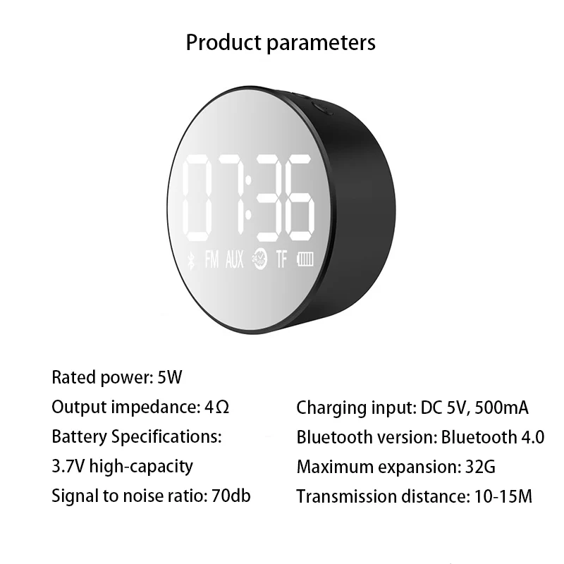 Portable TF Card AUX Playback Subwoofer Speaker FM Radio Clock Mirror Display Wireless Bluetooth Di